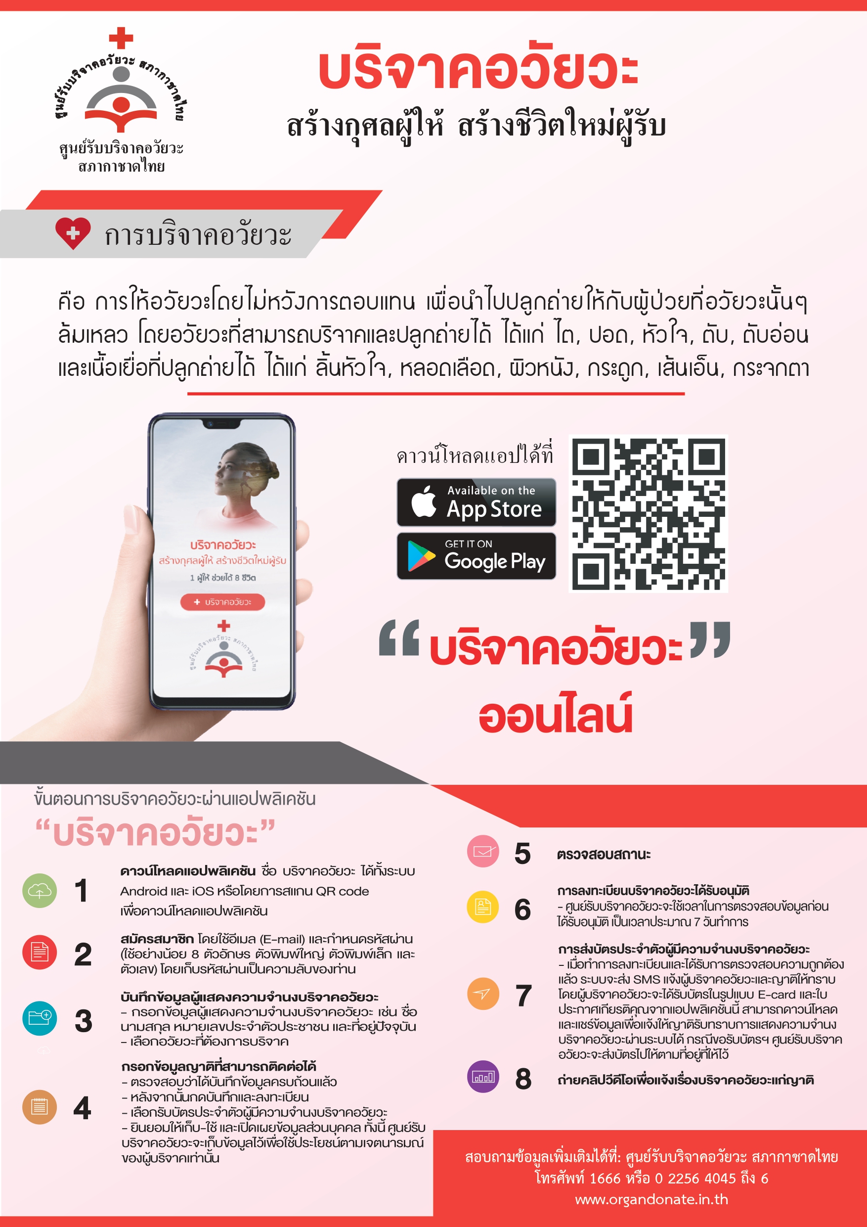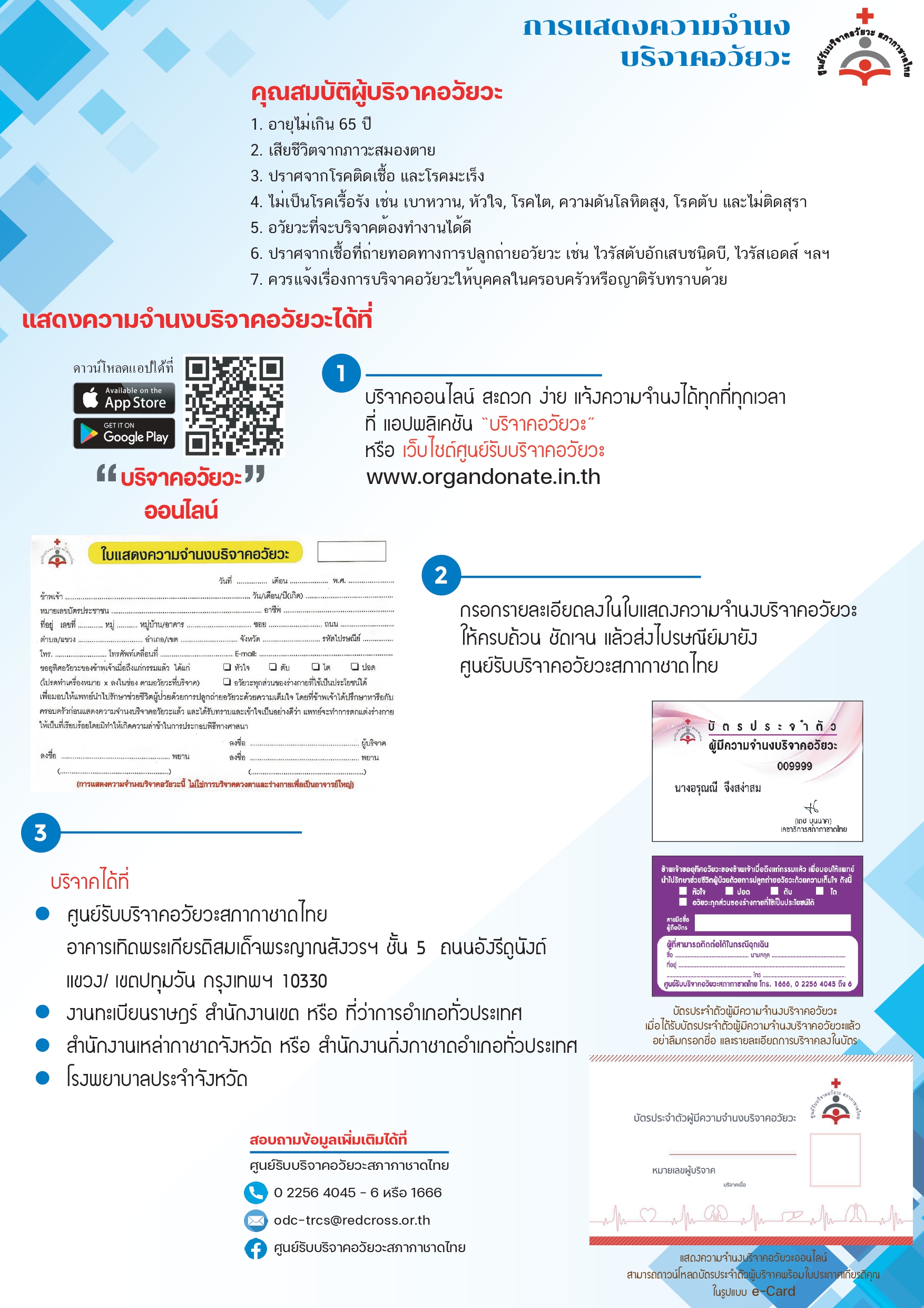 | รับแสดงความจำนงบริจาคอวัยวะจากทั่วประเทศ โดยติดต่อได้ที่ศูนย์รับบริจาคอวัยวะสภากาชาดไทย, เหล่ากาชาดจังหวัดทุกแห่ง, โรงพยาบาลประจำจังหวัด | แสดงความจำนงโดยติดต่อได้ที่คณะแพทยศาสตร์ทุกแห่ง ซึ่งแต่ละแห่งมีเกณฑ์การรับอุทิศร่างกายต่างกัน |